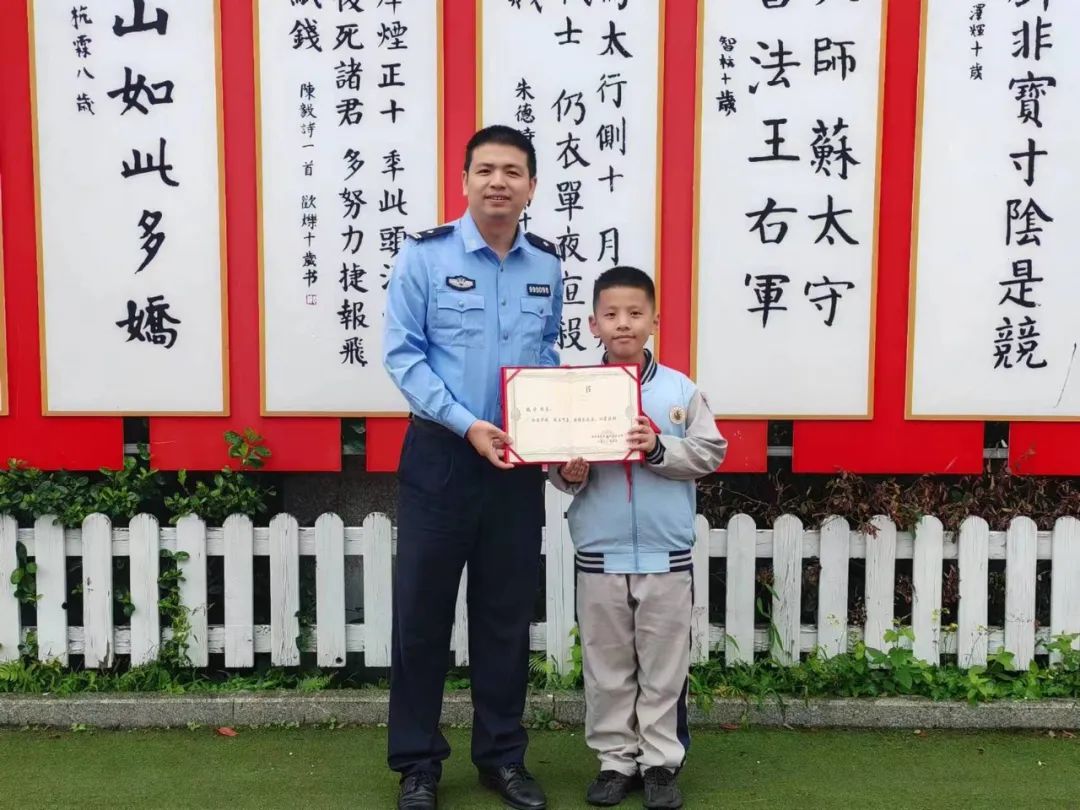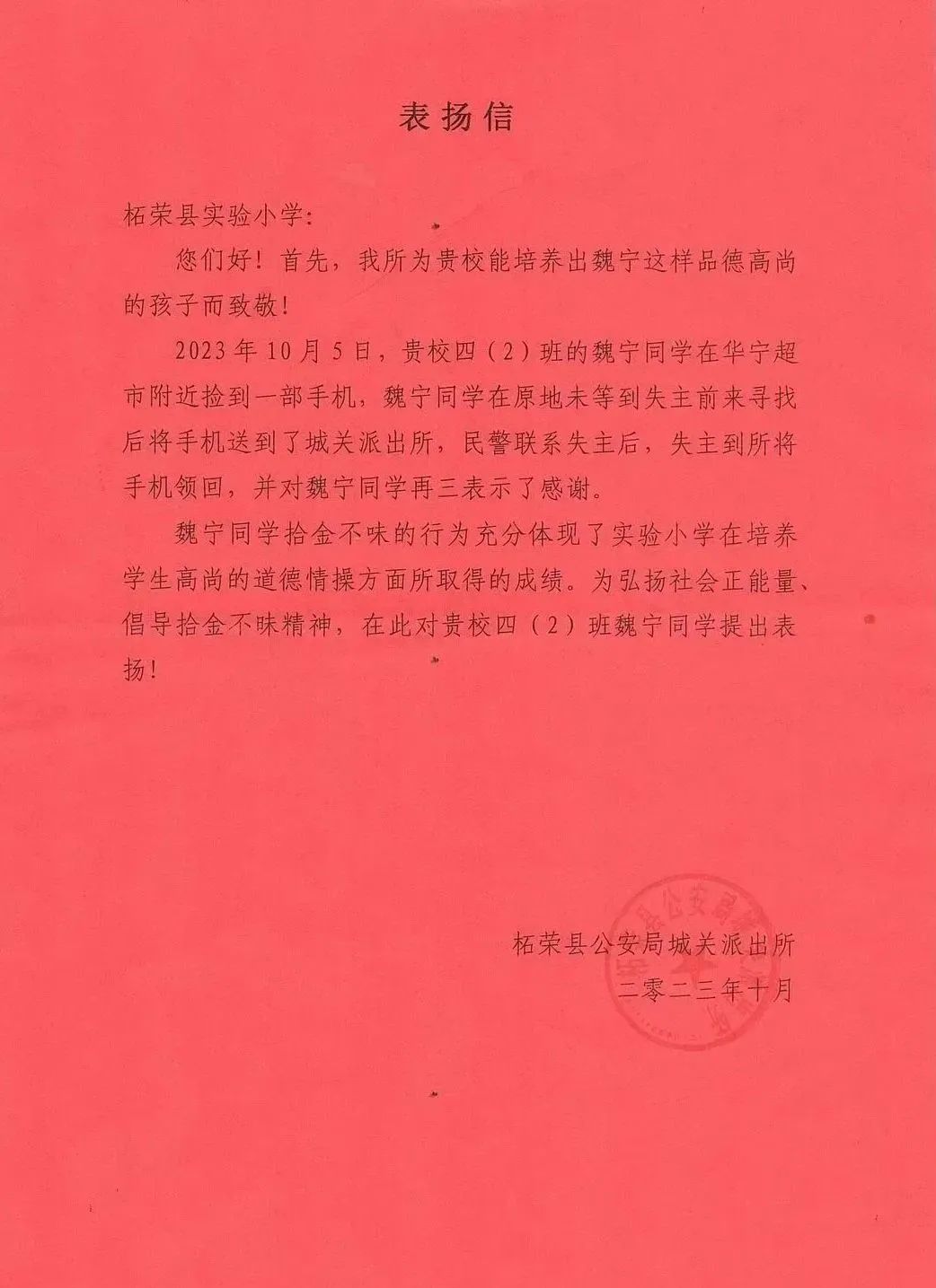 2023年10月5日,贵校四(2)班的魏宁同学在华宁超市附近捡到一部手机,魏宁同学在原地未等到失主前来寻找后将手机送到了城关派出所,民警联系失主后,失主到所将手机领回,并对魏宁同学再三表示了感谢。