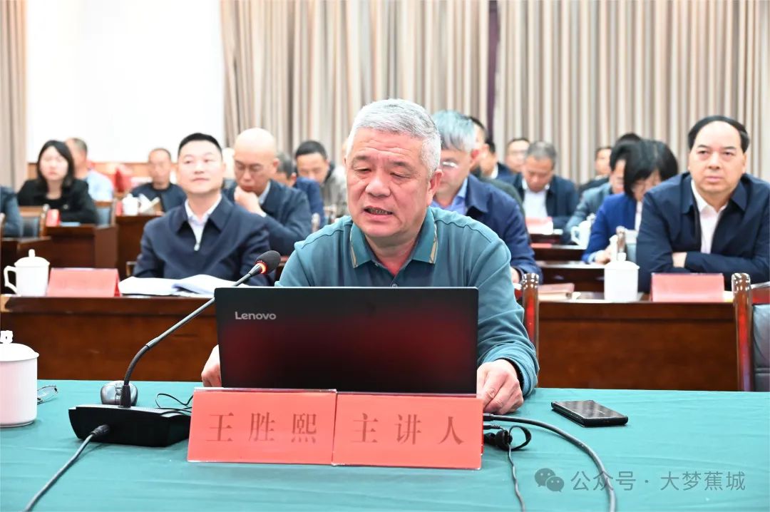 大梦蕉城(周思颖)4月10日下午,蕉城区委理论学习中心组召开学习会,邀请省乡村振兴研究会常务副会长、省住房和城乡建设厅原副厅长、一级巡视员王胜熙作题为《传统村落保护与活化利用》的专题辅导讲座。区委书记何必良主持并讲话,区人大常委会主任钟宜国等区领导在主会场参加。