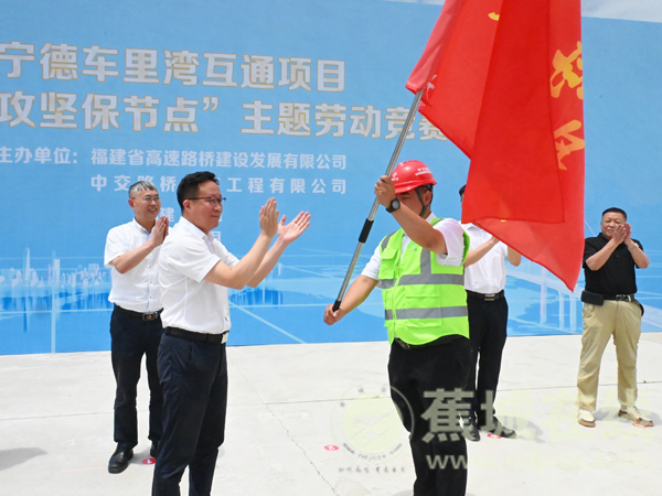 何必良代表蕉城区委、区政府作动员讲话。他表示,本次劳动竞赛动员大会正式吹响了宁德车里湾互通“大干七十天,攻坚保节点”的冲锋号。自宁德车里湾互通项目开工以来,参建各方展现出了不一般的比拼豪情,取得了一个又一个的节点胜利。今天授予的战旗既是荣誉也是要求,希望大家大力发扬“大干晴天,抢干阴天,巧干雨天,干好每一天”的四干精神,接续奋斗、持续发力,谋攻坚之举、兴攻坚之势、担攻坚之责,以必胜的信心各显身手,在七十天攻坚战中竞出风采、比出激情、赛出硕果,再创项目建设的蕉城记录。