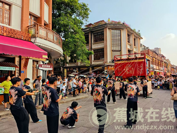 节目画面中,伴随着欢快的节拍,一只只栩栩如生的线狮在少年队员们灵巧的提拉操控下,仿佛被注入了灵魂与生命。它们时而威猛腾空,气势非凡;时而翻滚跳跃,灵动矫健;时而互相嬉戏打闹,憨态可掬;时而又为争抢彩球奋勇向前,每一个高难度动作都精准流畅、牵动人心。现场市民游客被深深吸引,人群中不时爆发出阵阵惊叹与热烈的掌声,古老的非遗技艺与历史文化街区交相辉映,营造出浓厚的节日氛围。