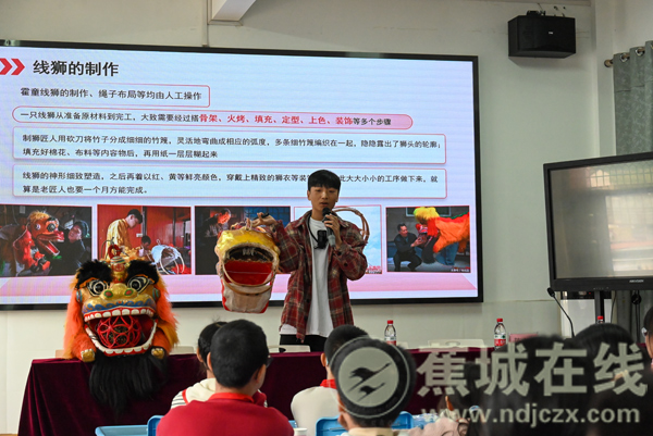 课堂上,兴贤少年线狮队队长向学生们介绍了线狮的历史渊源、文化价值以及在民间盛行的表演特点。通过生动的讲述,孩子们了解到线狮虽小,却“线牵千戏”,以灵动细腻的动作闻名,简短的介绍让学生对这门传统技艺有了更直观的认识,课堂气氛轻松又专注。
