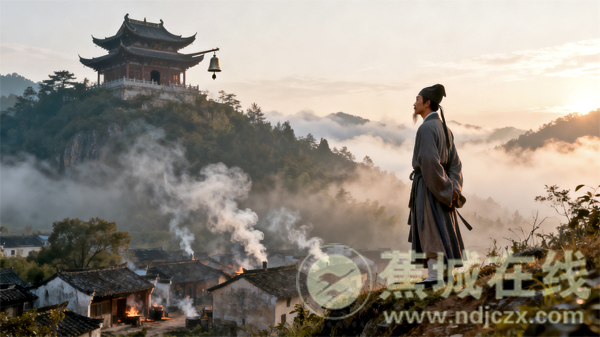 山寺楼阁传来晨钟暮鼓,仿佛在催促时光流转,村落间炊烟与云雾缭绕,自古至今皆是如此景象。