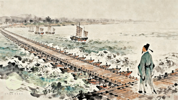 宽阔的浮桥可容多车并行,稳稳地架在汹涌的江涛之上,千百艘船只横向相连,锚定在大江中央。