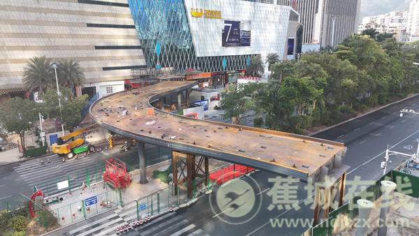 记者在现场看到,天桥的主体钢结构已全部架设完成,初具雏形。施工人员正在高空作业平台上,仔细进行梁底装饰工程的安装与修饰工作。万宝天桥的设计不仅注重实用性,也兼顾了与周边现代商业氛围的协调。其建成后,将显著提升行人过街的安全性与舒适度,有效分流路面人流,缓解天湖路相关路口的交通压力,进一步激活商圈活力,完善该区域的城市功能配套。