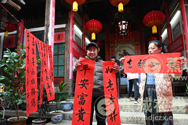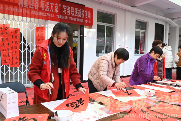2月4日,蕉南街道芦坪社区联合宁德市气象局、蕉城区妇联、蕉南街道新时代文明实践所,举办“我们的节日·春节”——“翰墨迎春福送万家”写春联送祝福活动。书法爱好者们挥毫泼墨,一副副充满吉祥寓意的春联和“福”字跃然纸上,或苍劲有力,或秀气婉约,传递着对新春的期盼。居民们纷纷围拢挑选,等待墨宝晾干,脸上洋溢着笑容。社区干部、网格员、楼长与共建单位代表、志愿者还将春联和“福”字送到居民家中,并帮助张贴上门。红彤彤的春联为社区增添了节日色彩,也送去了新春关怀。 □ 陈菱舟 摄