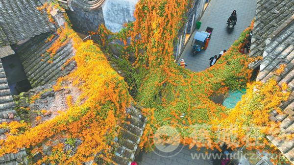 长长的花藤如瀑布般倾泻而下,又似万千橙红色的绸带,在微风中轻盈摆动。它们密密匝匝地簇拥在一起,开得热烈而张扬,仿佛一串串即将点燃新春喜悦的鞭炮,又像为这座静谧的千年古镇,量身定制了一件流光溢彩的“黄金甲”。阳光透过花隙洒下,在地上投下斑驳光影,给古老的白墙黛瓦镀上了一层温暖的柔光。